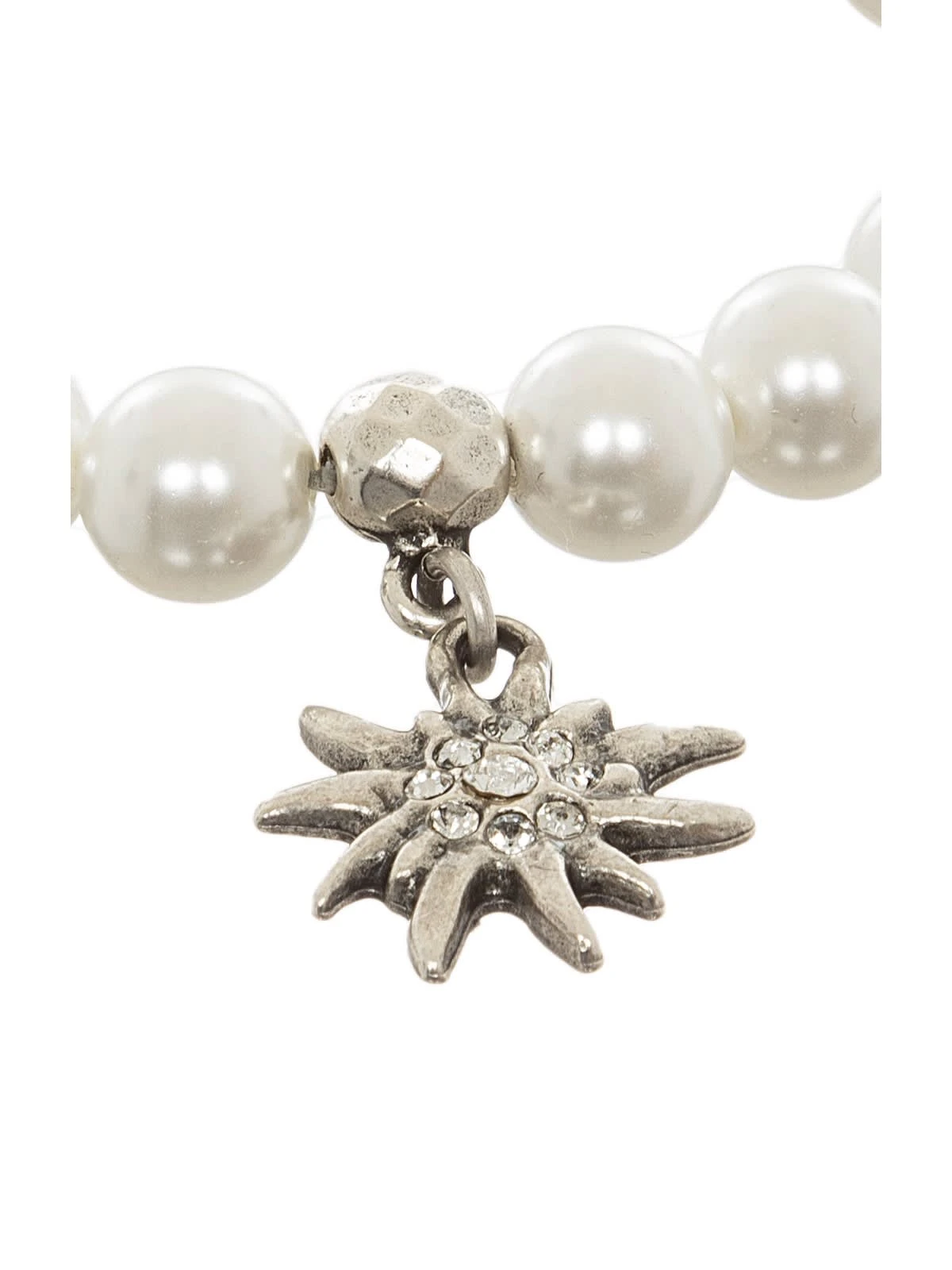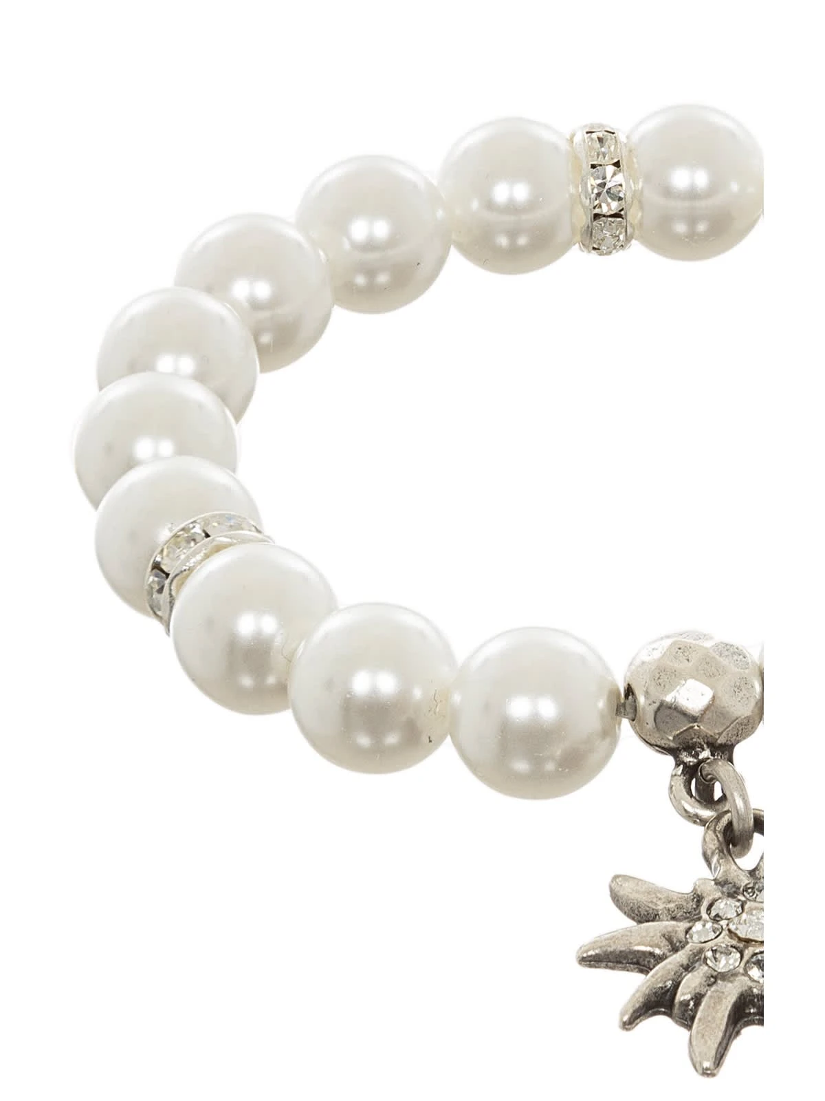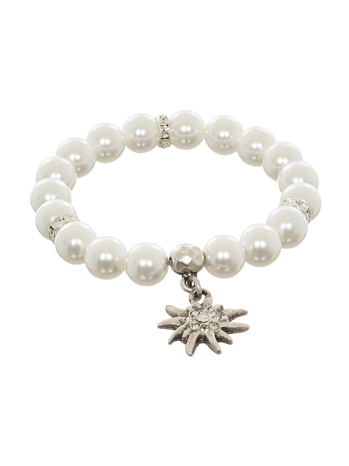 Tradition trifft Eleganz. Das elastische Armband lässt sich sowohl zum klassischen Dirndl als auch zur modischen Jeans tragen. Es ist aus perlmuttfarbenen Wachsperlen gearbeitet, die in regelmäßigen Abständen von einem Strassring gerahmt werden. Das Highlight ist jedoch der silberfarbene Edelweiß-Anhänger, der das Armband geschmackvoll verziert und ihm seinen Trachtenlook verleiht.•Trachtenarmband •Wachsperlenkette •Alpenwahn