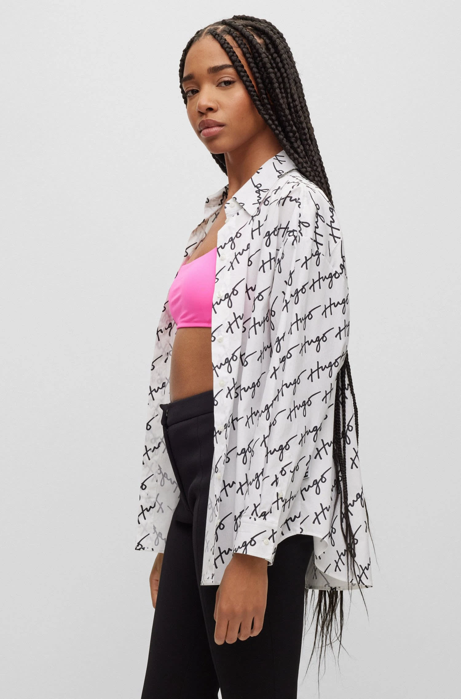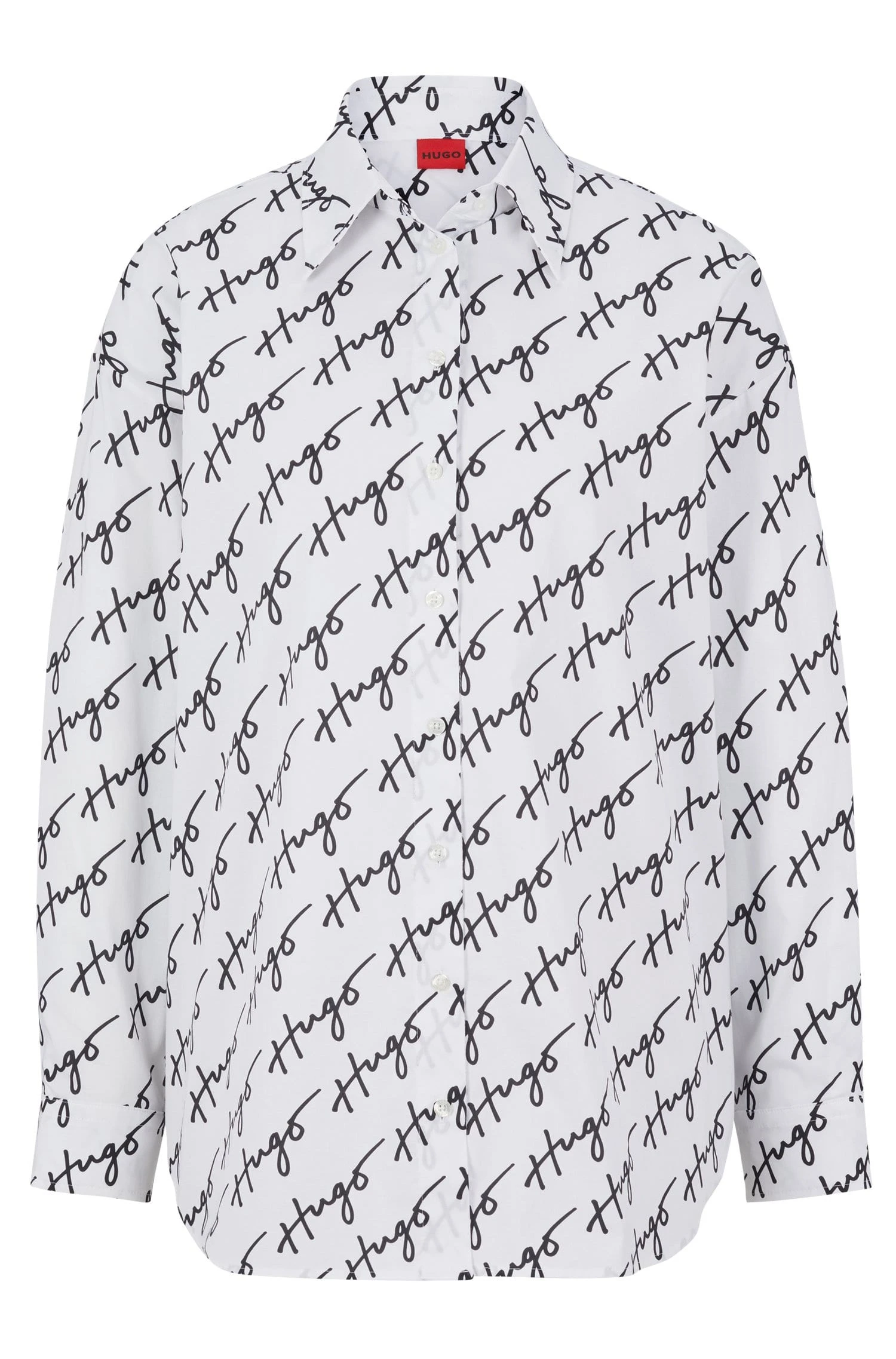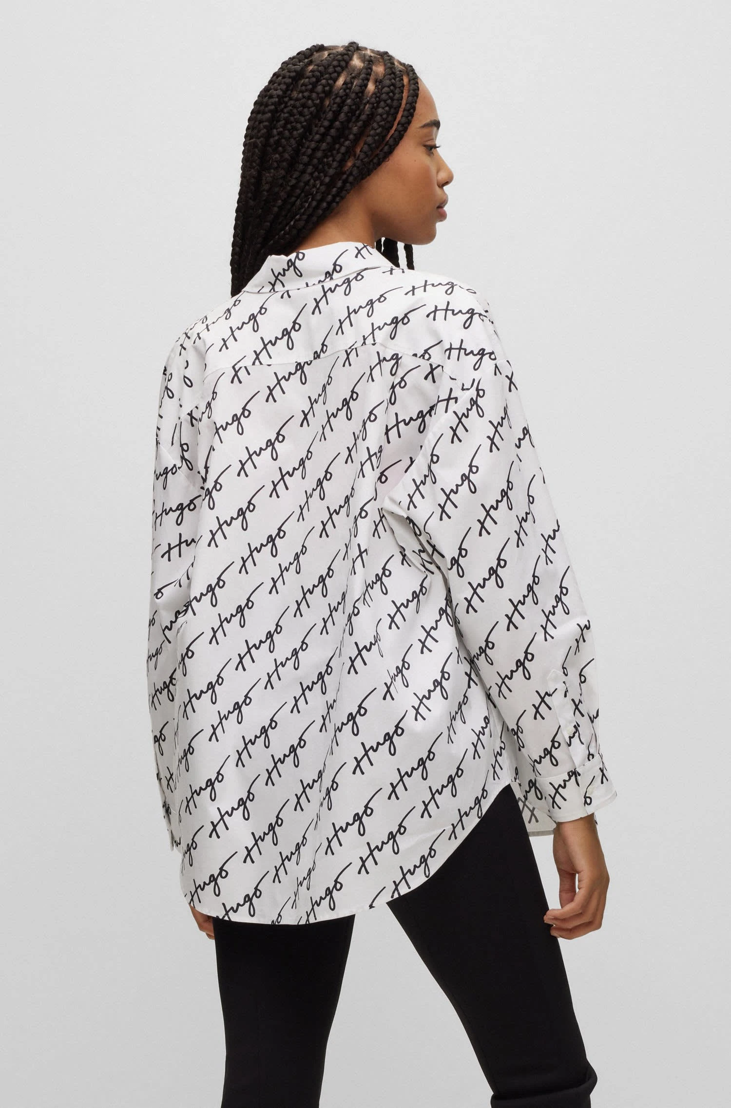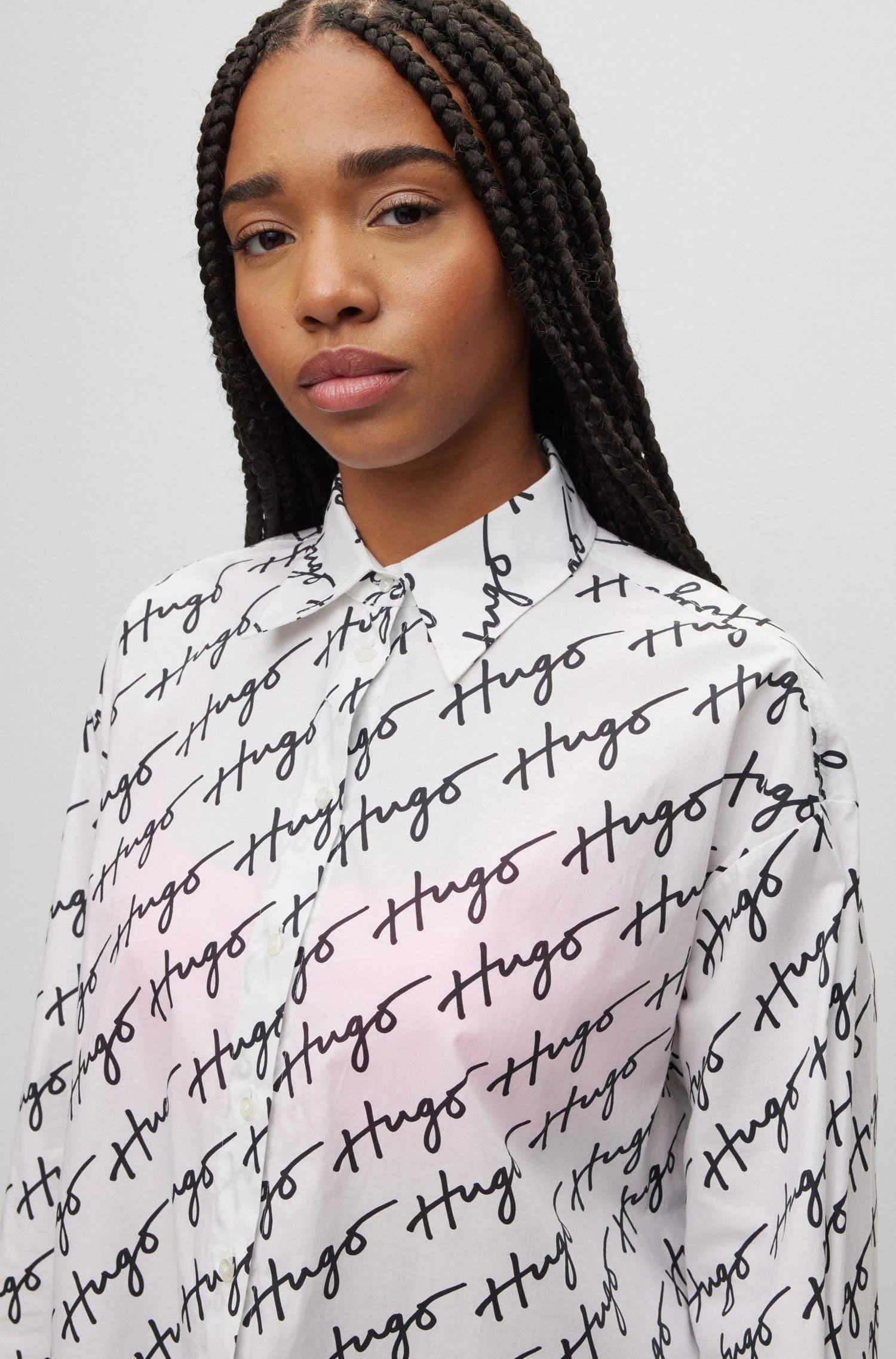 HUGO Damen-Bluse mit Oversize-Passform, die durchgehend mit handgeschriebenen Logos bedruckt ist. Oversize Fit / Übergroße Passfom Spitzkragen Durchgesteppte Knopfleiste mit acht Knöpfen Lange Ärmel Kapellenschlitze mit Knöpfen Gerade Manschetten Abgerundeter Saum Mit Allover-Print Pflegehinweise: Bleichen Nicht erlaubt, Bügeln geringe Temperatur, Nicht Trockner geeignet, Reinigen mit Perchlorethylen, Nur Handwäsche