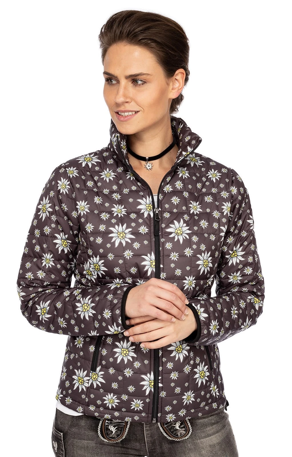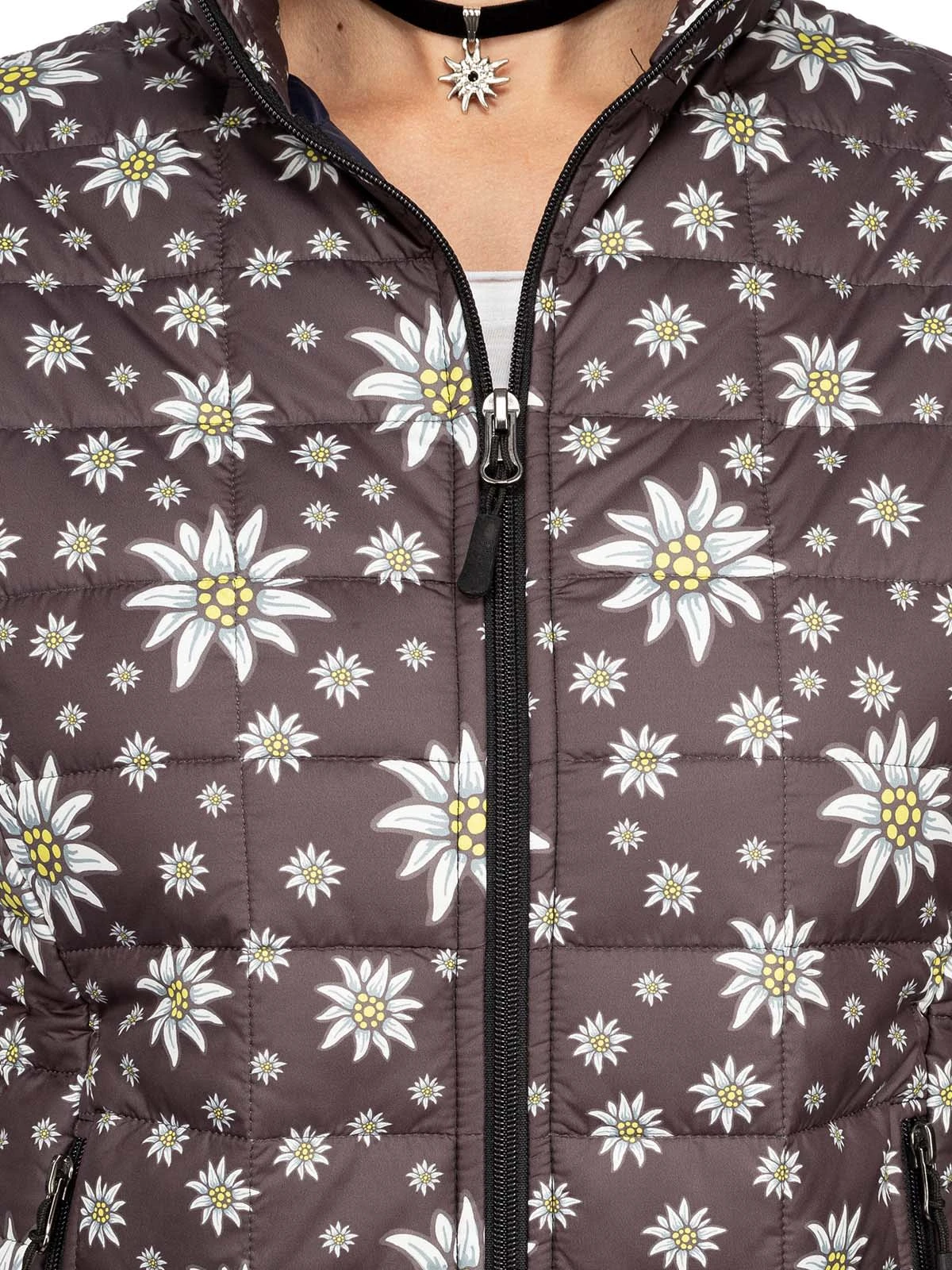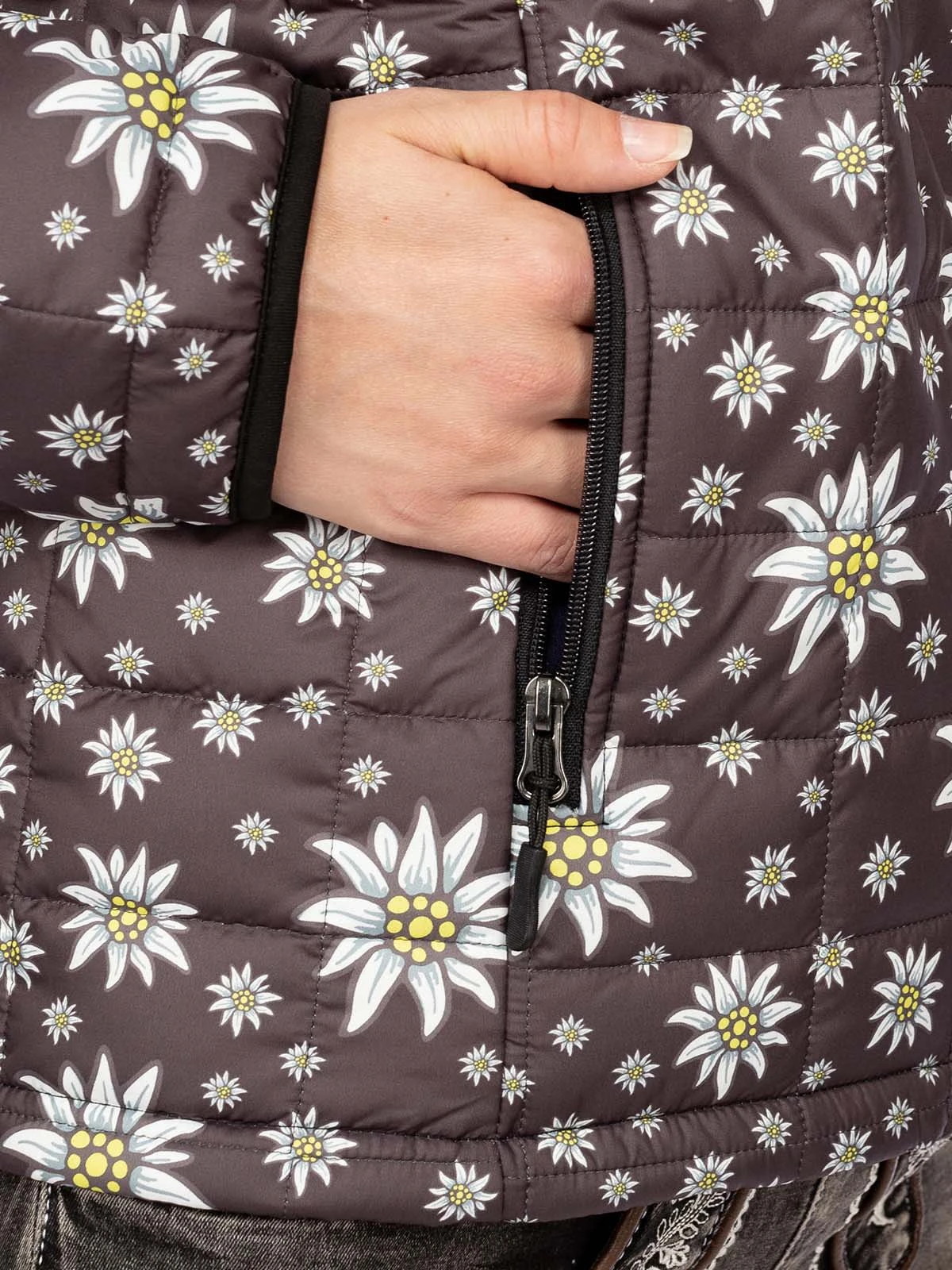 Edelweiß auf dunklem Grund. Die leichte Damenjacke 356301 der Marke ALP verfügt über eine komfortable Steppung und einen hohen Stehkragen. Sie ist sowohl atmungsaktiv als auch warm und winddicht. Der anthrazitfarbene Grundton wird von zahlreichen Edelweißblüten geschmückt. Geschlossen wird die sportliche Trachtenjacke mittels Reißverschluss und auch die beiden Einschubtaschen im Seitenbereich lassen sich mithilfe praktischer Zipper verschließen. Sie ist ein toller Begleiter für kühle Tage und passt perfekt zur modischen Jeans.•Diese Trachten Jacke fällt größengerecht aus. •ALP 1964 •Oberstoff 100% Polyester, Futter 100% Polyester •Damen