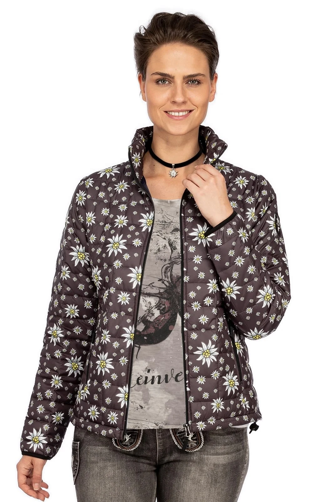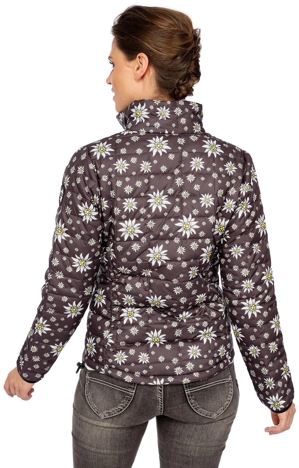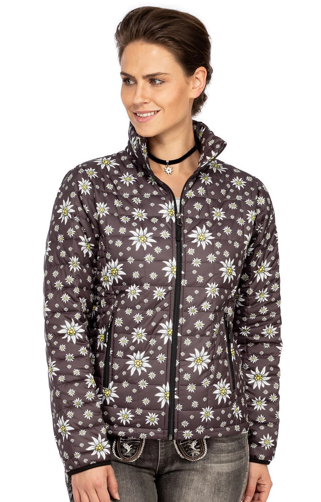 Edelweiß auf dunklem Grund. Die leichte Damenjacke 356301 der Marke ALP verfügt über eine komfortable Steppung und einen hohen Stehkragen. Sie ist sowohl atmungsaktiv als auch warm und winddicht. Der anthrazitfarbene Grundton wird von zahlreichen Edelweißblüten geschmückt. Geschlossen wird die sportliche Trachtenjacke mittels Reißverschluss und auch die beiden Einschubtaschen im Seitenbereich lassen sich mithilfe praktischer Zipper verschließen. Sie ist ein toller Begleiter für kühle Tage und passt perfekt zur modischen Jeans.•Diese Trachten Jacke fällt größengerecht aus. •ALP 1964 •Oberstoff 100% Polyester, Futter 100% Polyester •Damen