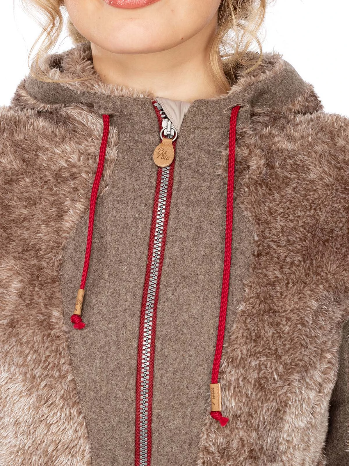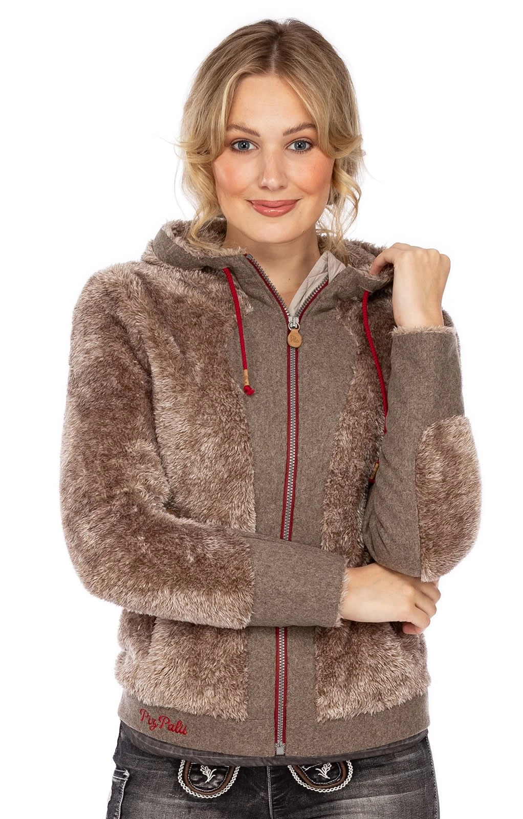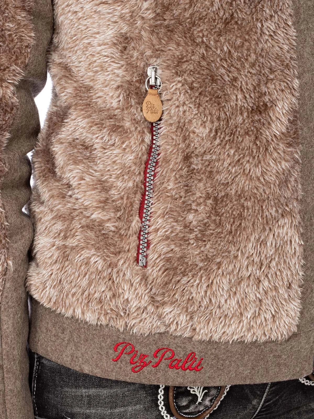 Freche Damenjacke GAUTING von Piz Palü. Originelle Kontraste sind das Markenzeichen des Labels Piz Palü, das auch hier wieder mit einem besonders attraktiven Modell überrascht. Die beige-rote Kapuzenjacke vereint glatte Stoffe mit kuscheligem Kunstpelz sowie beige mit roten Elementen. Der rot umrahmte Reißverschluss und die roten Kordeln der Kapuze fallen sofort ins Auge. Außergewöhnlich ist das dezent schimmernde Fellimitat. Diese kultige Jacke sorgt nicht nur auf dem Oktoberfest für Aufsehen.•Diese Trachten Jacke fällt größengerecht aus. •Piz Palü •100% Polyester, Oberstoff2 60% Wolle 20% Polyamid 15% Nylon 5% andere Fasern •Damen