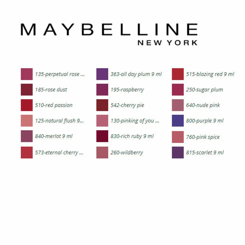 Bunt, gepflegt, langlebig? Maybelline Superstay 24H Lippenstift Keine Kompromisse! Die Farbe dieses flüssigen Lippenstifts hält bis zu 24 Stunden mit außergewöhnlicher Intensität. Umfassender Lippenbalsam verleiht den Lippen zusätzliche Pflege und Glanz. Ein weiteres Highlight für außergewöhnlichen Tragekomfort: Dank der bewährten Micro-Flex-Formel passt sich der Lippenstift den natürlichen Bewegungen der Lippen an. Verhindert auch das Austrocknen, Ausbleichen und Verfärben. Ob Cappuccino in der Mitte oder langes Date? Farben bleiben wo sie sein sollen. Dieser Applikator trägt auch Farbe präzise und gleichmäßig auf. 100% liebenswert! Inhaltsstoffe: Die verbindliche Angabe der Inhaltsstoffe entnehmen Sie bitte der Verpackung des gelieferten Produktes. Dimethicone, Bis-Diglyceryl Polyacyladipate-2, Hydrogenated Polyisobutene, Phenyl Trimethicone, Talc, Tridecyl Trimellitate, Hydrogenated Jojoba Oil, Dimethicone Crosspolymer, Isostearyl Isostearate, Paraffin, Nylon-12, Isohexadecane, Vinyl Dimethicone/Methicone Silsesquioxane Crosspolymer, Cera Microcristallina / Microcrystalline Wax, Alumina, Polyethylene, Synthetic Wax, Calcium Sodium Borosilicate, Pentaerythrityl Tetra-Di-T-Butyl Hydroxyhydrocinnamate, Silica, Calcium Aluminum Borosilicate, Synthetic Fluorphlogopite, Tin Oxide, Benzyl Alcohol, Colophonium / Rosin, Magnesium Silicate, Limonene, Benzyl Benzoate, Anise Alcohol, Aluminum Hydroxide, Tocopherol, [+/- May Contain: Ci 77891 / Titanium Dioxide, Ci 45410 / Red 28 Lake, Ci 15850 / Red 7, Ci 77491, Ci 77492, Ci 77499 / Iron Oxides, Ci 45380 / Red 22 Lake, Ci 15985 / Yellow 6 Lake, Ci 19140 / Yellow 5 Lake, Ci 15850 / Red 6, Ci 17200 / Red 33 Lake, Ci 77742 / Manganese Violet, Ci 15850 / Red 7 Lake, Ci 77120 / Barium Sulfate, Mica, Ci 42090 / Blue 1 Lake, Ci 75470 / Carmine]. (F.I.L. B216910/1)