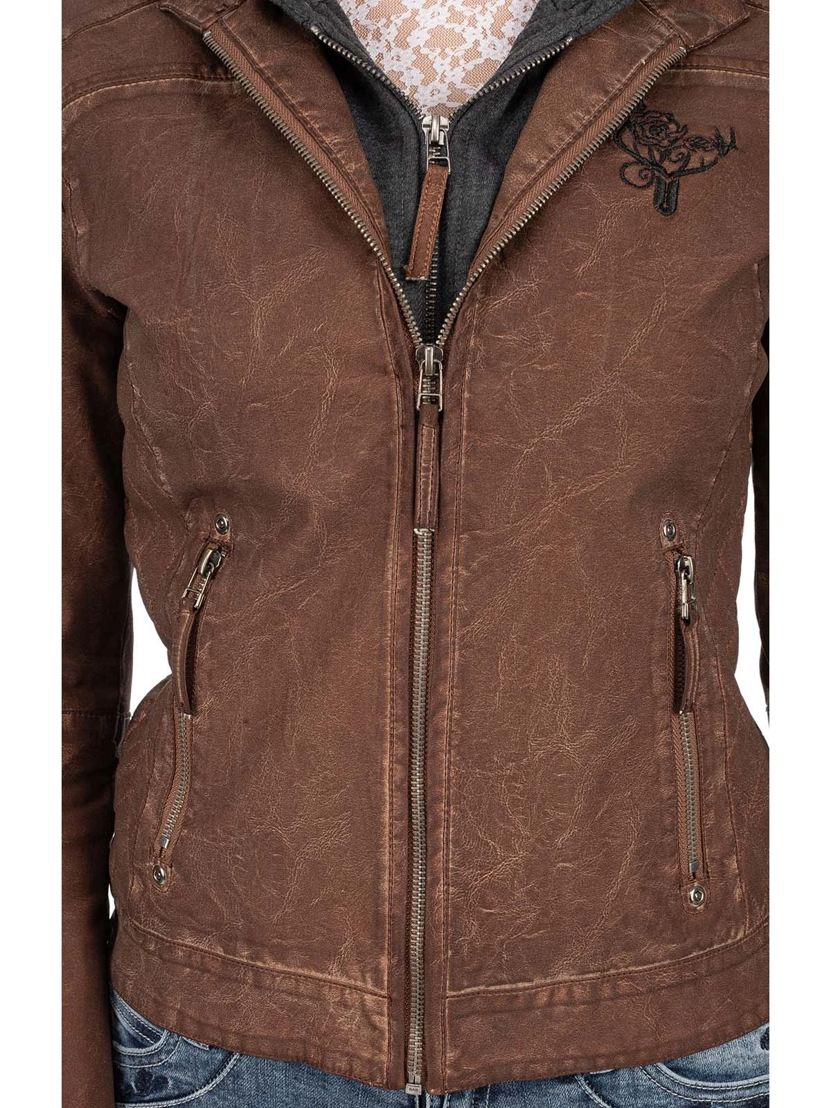 Modische Damenjacke von Hangowear. Auffälligstes Merkmal der Outdoorjacke HAILEY aus dem Hause Hangowear ist der angesagte 2-Lagen-Look, der diesem Modell aus unserem Onlineshop das gewisse Etwas gibt. Die Jacke in der Farbe Cognac verfügt über eine eingearbeitete Kapuze in Grau und ist am Rücken mit einer großen Logo-Stickerei samt Schriftzug versehen.•Diese Trachtenjacke fällt größengerecht aus. •Jacke •85% Viscose,15% Polyester, Futter1 100% Polyurethan, Futter2 100% Polyester