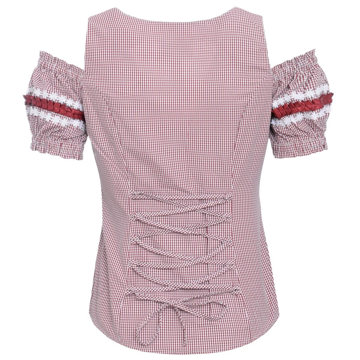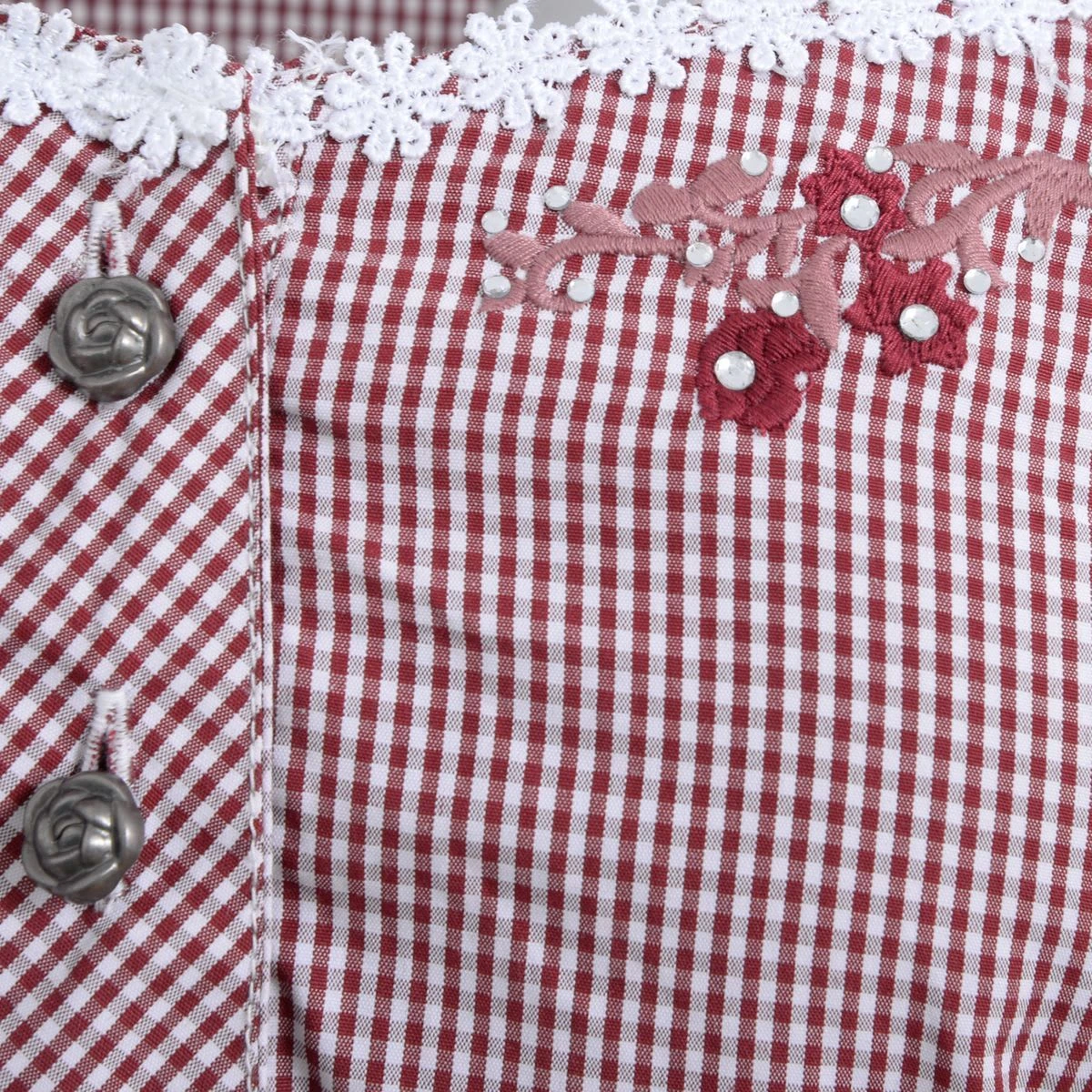Die tolle Carmenbluse Britt Maren in Rot von Marjo Trachten! Die karierte Trachtenbluse ist mit schönen Rüschen an den Schulterärmeln verziert. Die verstellbaren Schnallen an den Schultern und dem Gummizug an den Ärmeln, sorgen für einen optimalen Sitz. Am Brustbereich ist sie mit kleinen glitzernden Steinchen geschmückt. Auf der Vorderseite ist sie mit Rosenknöpfen zu schließen. Am Rücken befindet sich eine Schnürung. Idealerweise kombinieren Sie die Trachtenbluse zum Trachtenrock oder zur Lederhose.