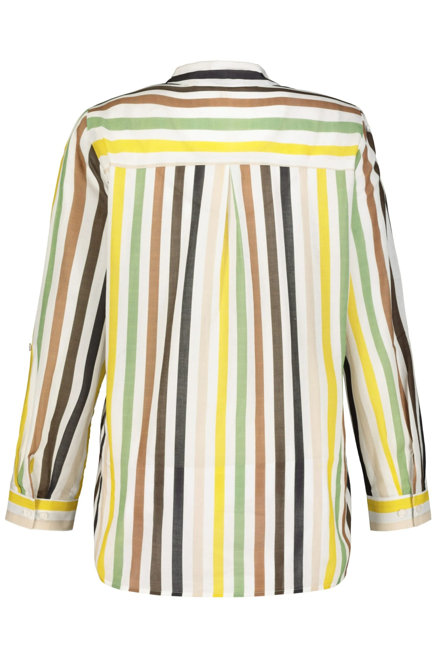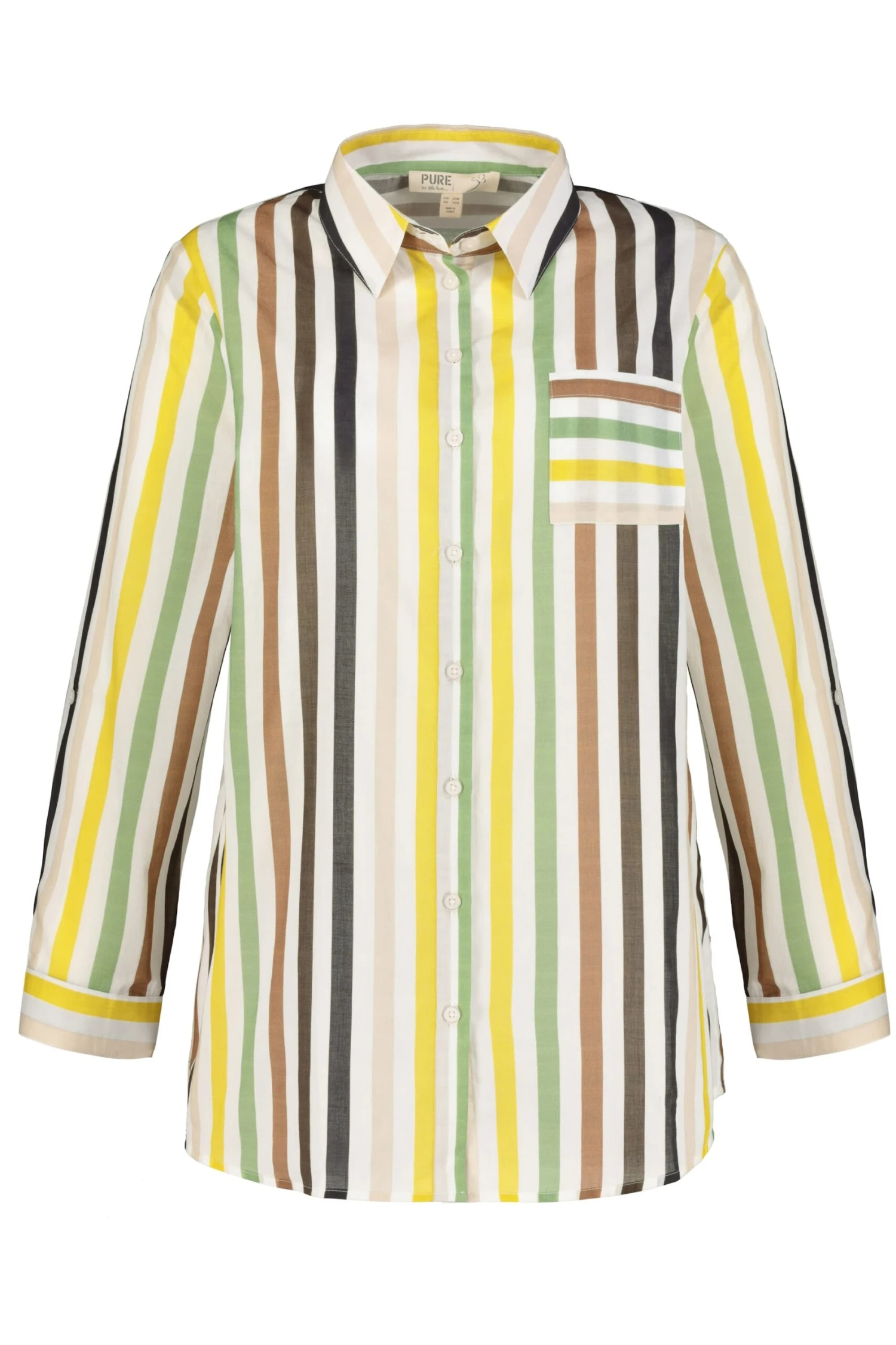 Hemdbluse aus feiner Biobaumwolle mit farbigen Streifen. Hemdkragen, Brusttasche, Langarm mit Manschetten und Krempelriegel. Organic; certified by ECOCERT Greenlife Licence no. 152026.