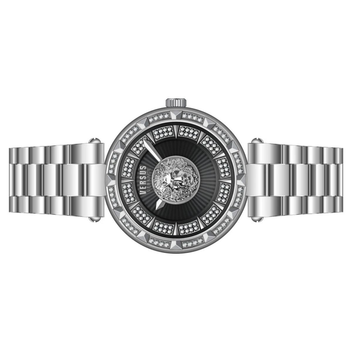 Hersteller: Versus ModellNr : VSPQ13821 (Crystal Sertie ) Zifferblatt: Analoganzeige, Farbe: schwarz mit 3d-Löwenkopf, mit Steinchen besetzt Gehäuse: Edelstahlgehäuse silberfarben, Lünette mit Steinchen besetzt, Durchmesser ca. 36 mm, Höhe:ca. 11,5 mm Gehäuseboden: Edelstahl mit Herstellerlogo Armband: Edelstahlarmband silberfarben Breite: ca. 1,8 cm Länge der Uhr: ca. 18,5 cm Faltschließe Dichtheit: Wasserdicht 3 ATM (30 m) Funktionen / Anzeigen: kratzunempfindliches Mineralglas, Batteriebetriebenes Quarz Uhrwerk Stunden – Minutenanzeige Lieferumfang: Auslieferung in Versus by Versace Geschenkbox