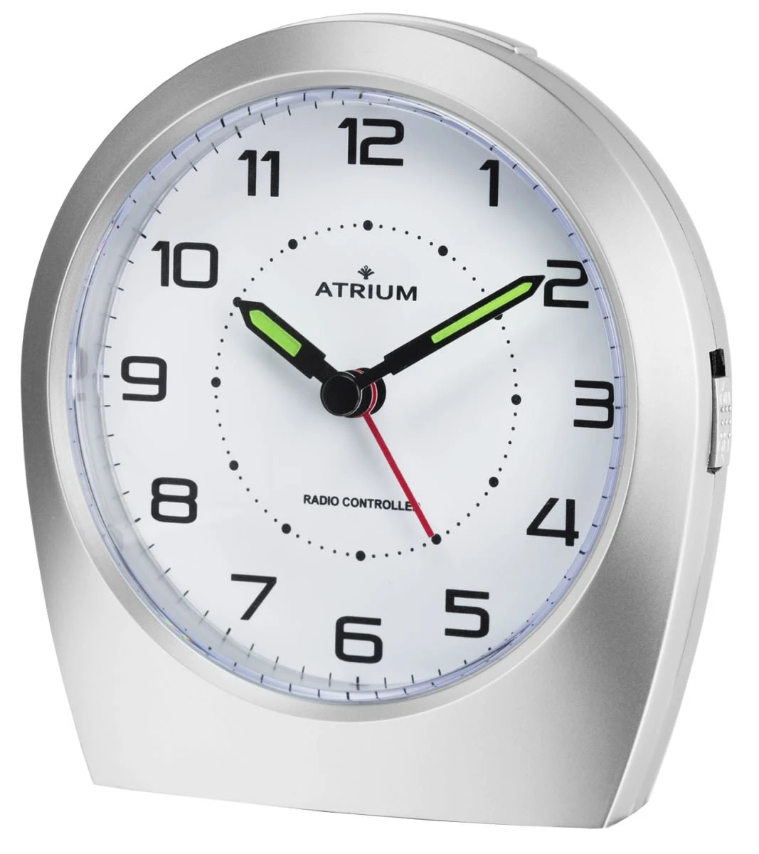 Hersteller: ATRIUM ModellNr: A620-19 Zifferblatt: analog, Zifferblattfarbe: weiß Technik: Quarz analog, Funk DCF77 Gehäuse: Kunststoffgehäuse silber Durchmesser: ca. 11,0 cm, Funktionen / Anzeigen: • Funkwecker analog • Snooze (Weckwiederholung) und Licht • Seitenabsteller • 4-stufiges Wecksignal Piepton • Leuchtzeiger Lieferumfang: 1 x Wecker (Batterie 1 x AA nicht inklusive) in PE-Beutel + Kartonbox Der ATRIUM Funkwecker zeichnet sich aus durch ein klassisches und zeitloses Design. Er empfängt das Signal über den Zeitzeichensender DCF77 bei Frankfurt. Die Zeiteinstellung, sowie Umstellung von Sommer- und Winterzeit erfolgen automatisch. Die abgerundete Form in matt Silber und schlichtem Zifferblattdesign, verleihen ihm sein dezentes und schickes Aussehen. Der Quarzwecker ist mit den wichtigsten Funktionen ausgestattet: Einem sehr gut hörbaren Alarm mit seitlichem Absteller, wahlweise kann dabei die Snoozefunktion aktiviert werden. Mit dem obigen Knopf wird auch das Zifferblatt beleuchtet, nach 5 Sekunden geht das Licht automatisch aus.
